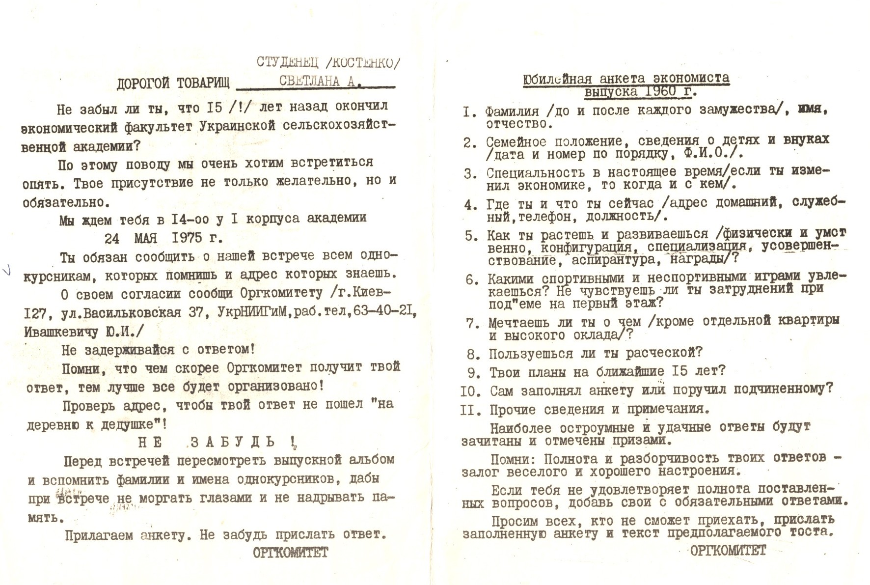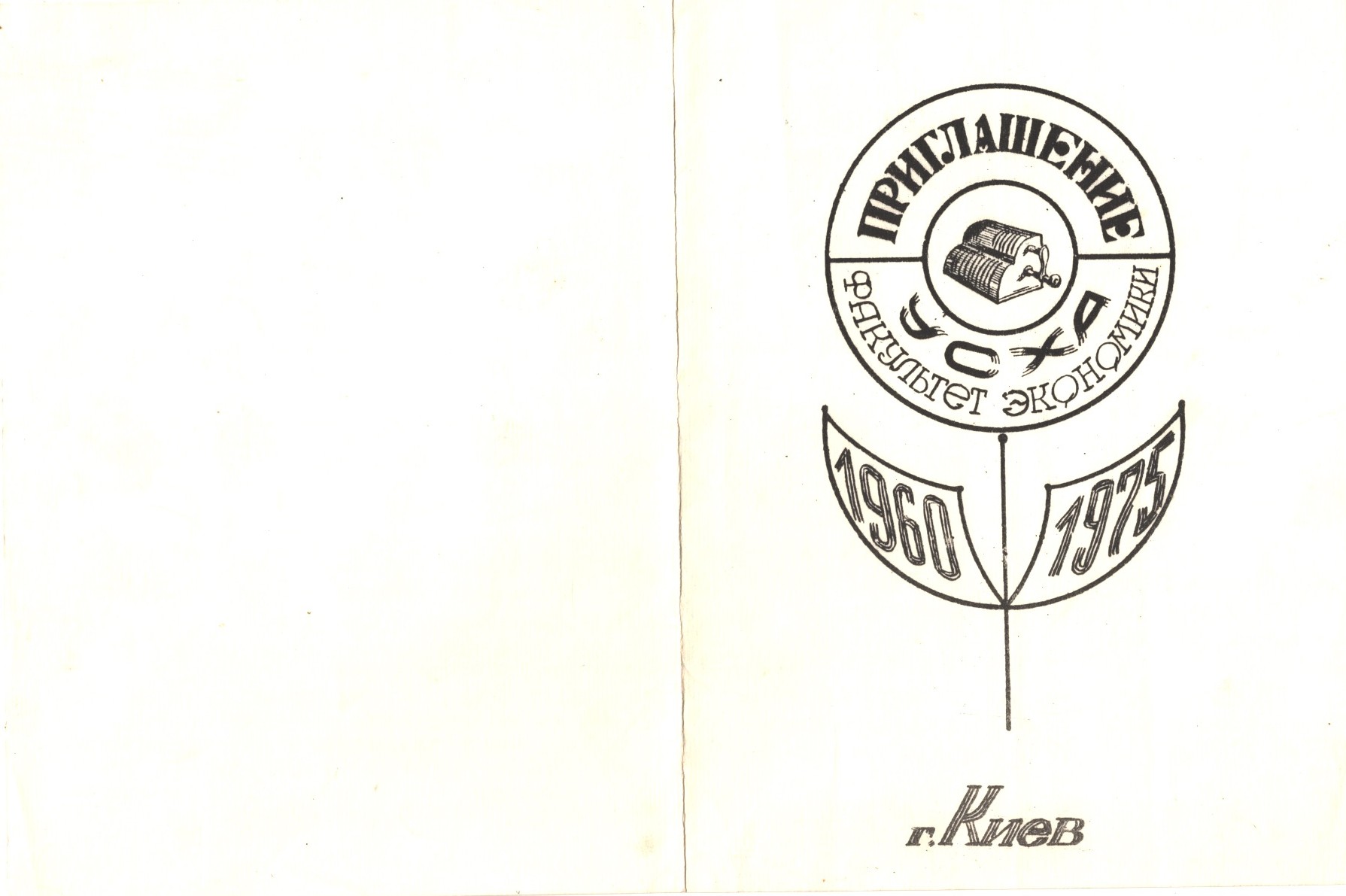 1975 рік. Запрошення на зустріч випускників факультету економіки та організації соціалістичного господарства. Випуск V (1955-1960 рр.)